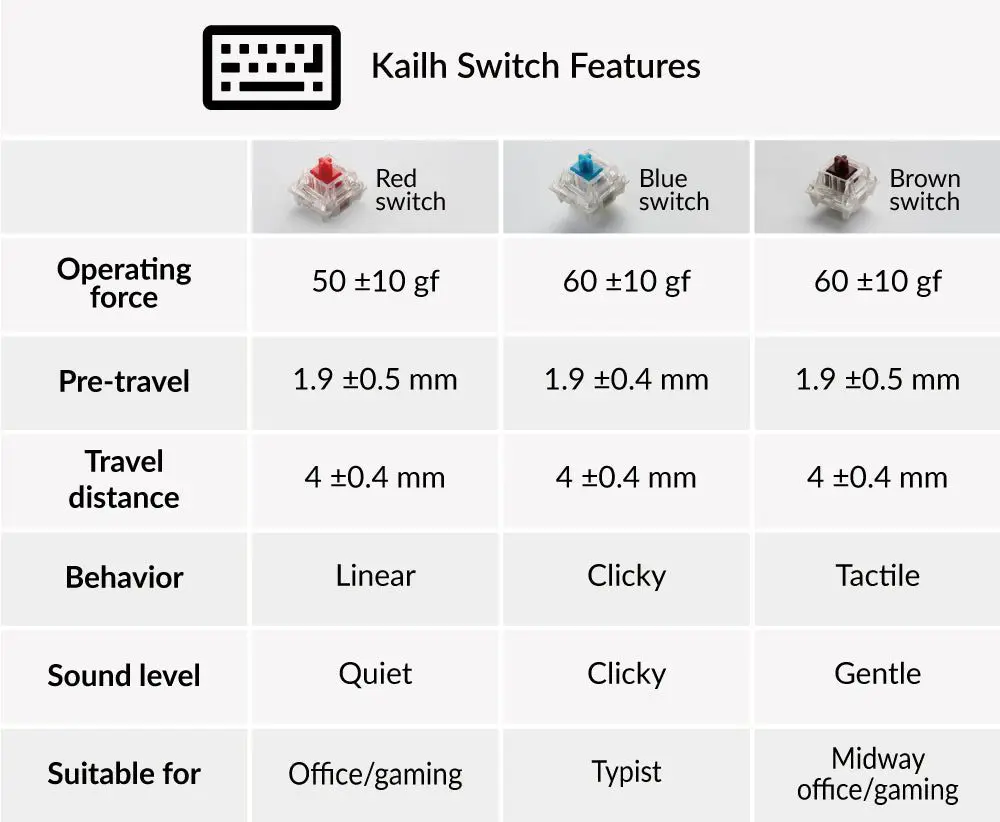 Using the popular Cherry MX form, Kailh switches make you get a brand-new feel without letting go of your favorite MX style keycaps. The default Kailh Switches red, blue and brown offer you the linear, clicky and tactile typing experience while different from other switch brands.